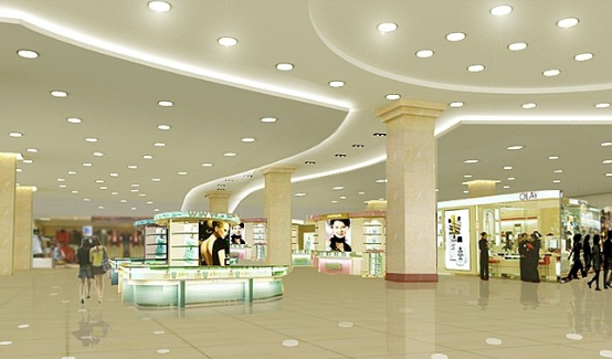 天花装饰与地面铺装比较接近,一方面可以通过漂亮有特色的天花装饰营造更好的购物环境另一方面可以通过不同的天花装饰起到分区的作用,引导人流前往不同的区域。