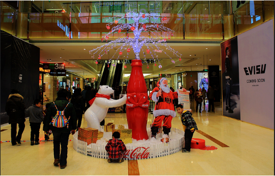 在室外,可以在广场处做一些景观小品,以达到吸引人流和聚集人流的效果。在室内,则主要在中庭等空间较为充裕的地方,与不同的节日相结合摆设一些景观小品,可以起到聚集人流、汇聚人气的效果。
