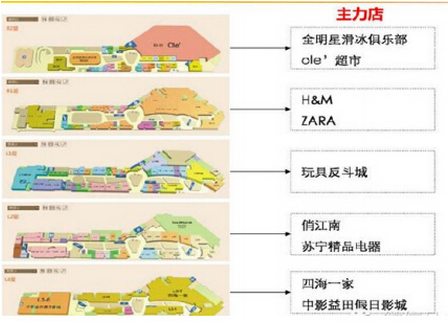 对于多层商业体来说,在每一层都设有主力店可以使每一层都具有核心引力,避免了由于某一层没有主力店而缺乏足够的吸引力,造成该层商铺的人流受到影响,人流可以较为均匀的到达该商业体的每一层中。