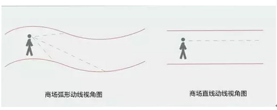 透过圆弧形动线,能让顾客视野的延伸性更强,可视性更强,单店的能见率更高,便于顾客到达店面。弧形动线被很多香港购物中心广泛采用,如又一城、太古广场等。