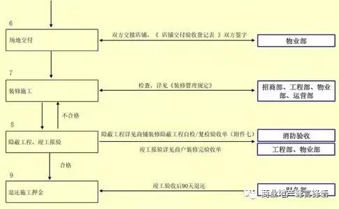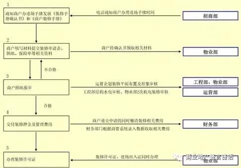 1) 商户进场及退场装修流程:通知商户办理进场、商户装修申请、交付装修押金及管理费用、商户装修设计图纸报审、场地交付、商户图纸消防备案、办理装修许可证、围挡申请及安装、装修管理、消防报验、竣工验收、退装修保证金。