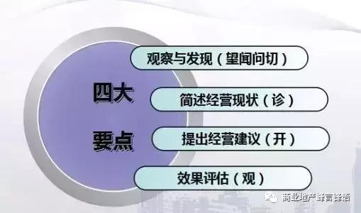 1)观察与发现(望闻问切);2)简述经营现状(诊);3)提出经营建议(开)——人员培训,品牌宣传,活动促销,经营环境,动线设计,管理机制;4)效果评估(观)。