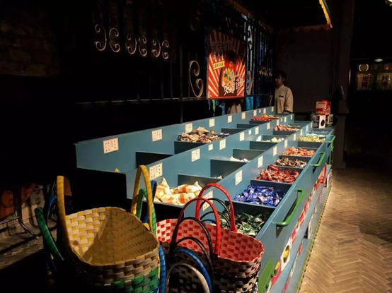 在沉浸式的打造上,和平菓局主要通过真人npc、展览播放两方面来实现。连特色小吃的售卖,也采用沉浸式的形式展现。这里有穿着不同服装的工作人员,他们的装扮,让人们好像回到了上世纪八九十年代。